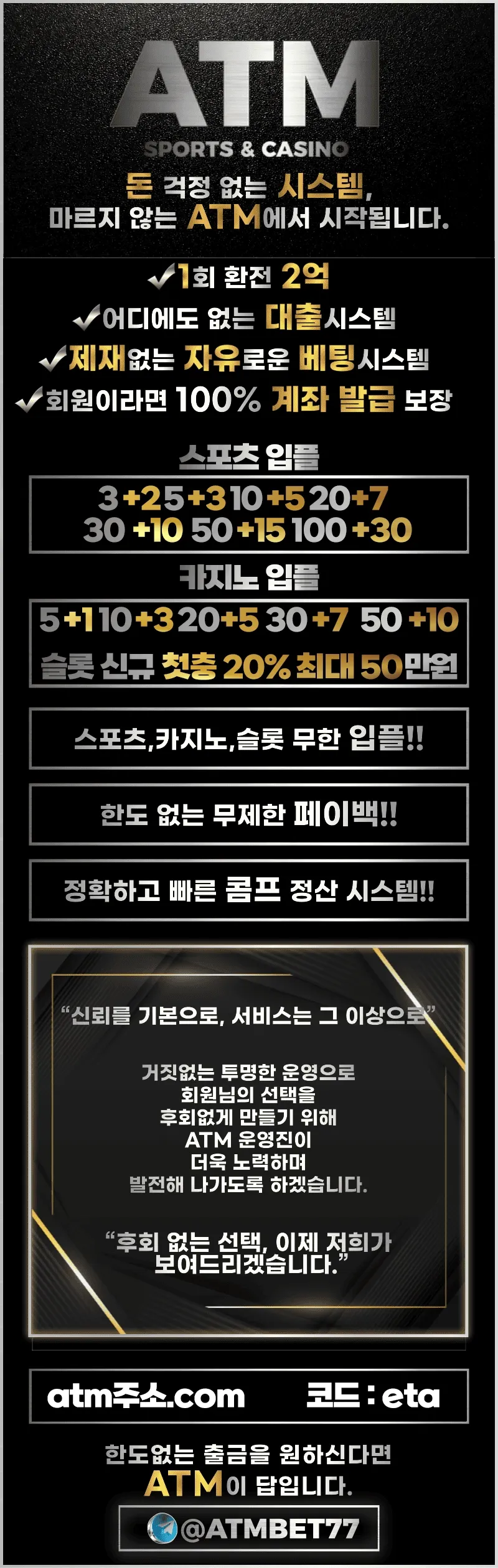 사이트 이름 ATM 링크 https://xn--atm-dn5np11a.com 코드 ETA 신규 혜택 스포츠입플, 카지노입플, 슬롯20%