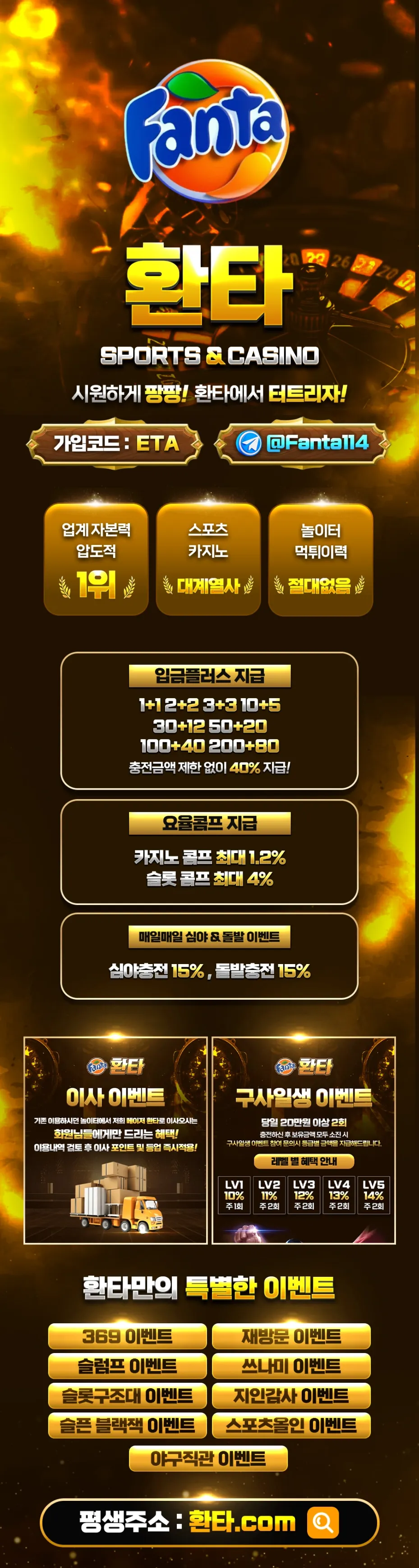 사이트 이름 환타 링크 https://ht-011.com/?affiliate=eta 코드 ETA 신규 혜택 입플 3+3 10+5 30+12 50+20 100+40